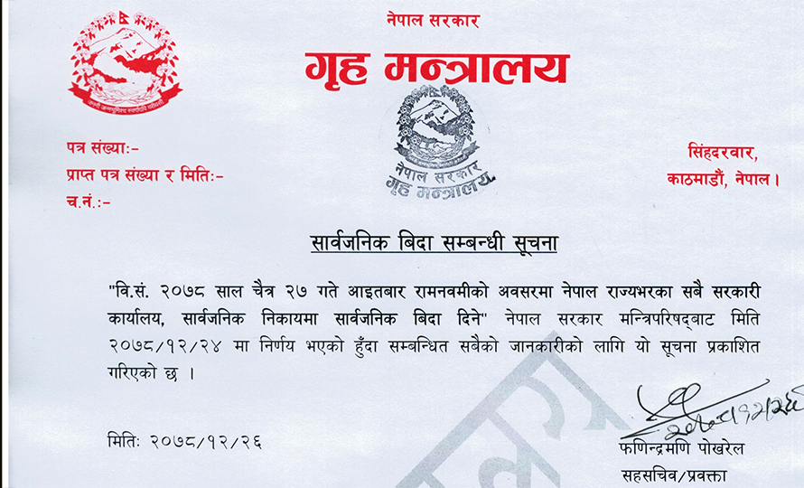 गृह मन्त्रालयले आज शनिबार सूचना प्रकाशन गरी रामनवमीको अवसरमा देशभरका सरकारी कार्यालय, सार्वजनिक निकायमा सार्वजनिक विदा दिने निर्णय जानकारी गराए ।
