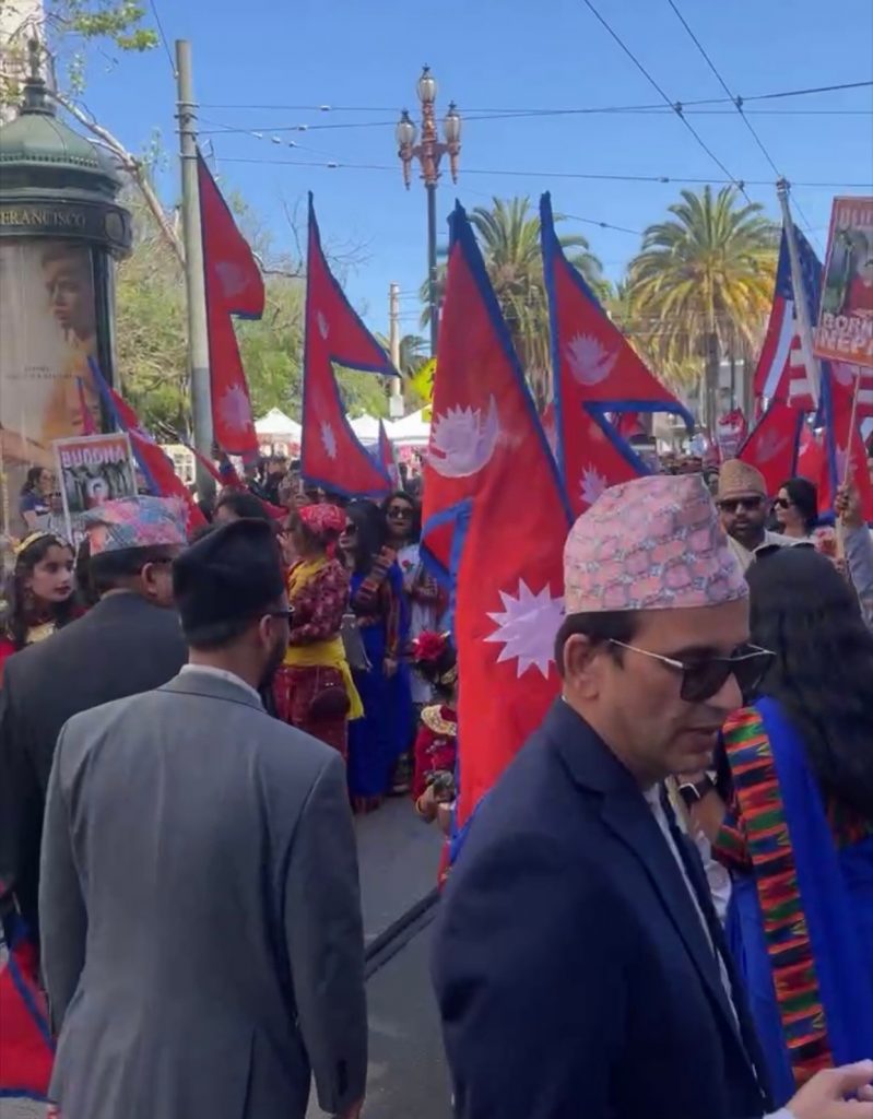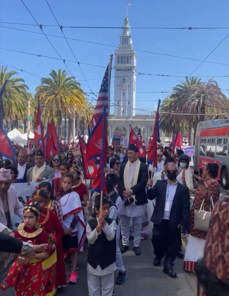 अमेरिकाको क्यालिफोर्निया राज्यस्थित सानफ्रान्सिस्कोमा हजारौ नेपालीहरु नेपाली राष्ट्रिय पहिरनमा सजिएर नेपालको राष्ट्रिय झन्डा बोकेर मार्च पास गरेका छन । कलासंस्कृति र पहिचान झल्किने खालको विभिन्न झॉकीसहितको भेषभुषामा शनिवार नेपाली समुदायले वृहत प्रदर्शन गरेका छन् ।